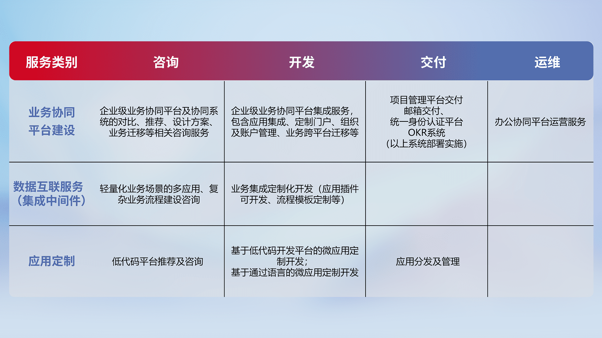 针对钉钉、、、企微、、、IDaas等平台级产品提供产品的规划、、、方案、、、、交付、、定制化开发等服务,,,实现如统一协同办公、、、智能客户服务、、、、混合会议管理、、、、智能数据查询、、、、等业务场景,,实现数字化转型。。。